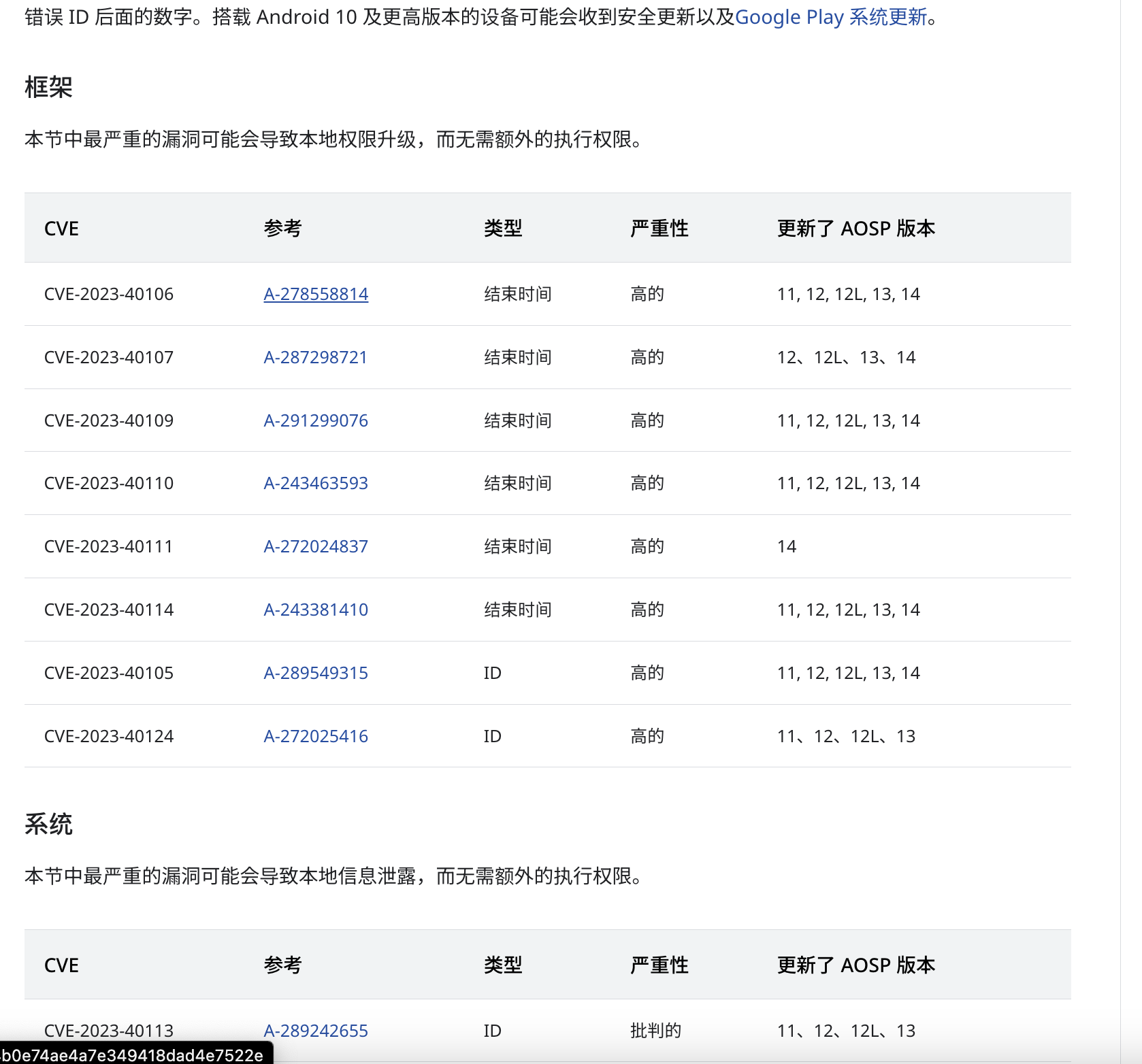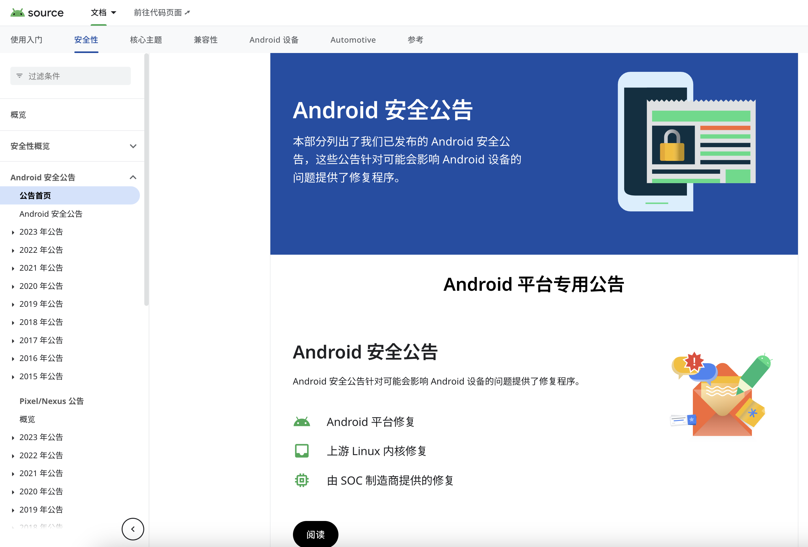 一般来说,Google 作为上游,会一直做维护并提供安全更新,然后下游厂商再来做适配。Google 的安全补丁会在下面这个网站上公布。